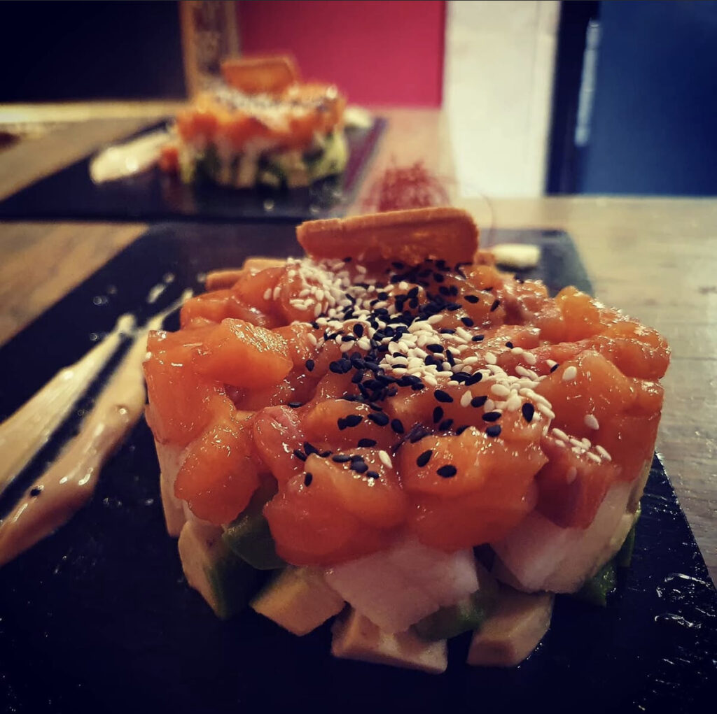 Carpaccio de gambas con huevas de tobiko y vinagreta de yuzu