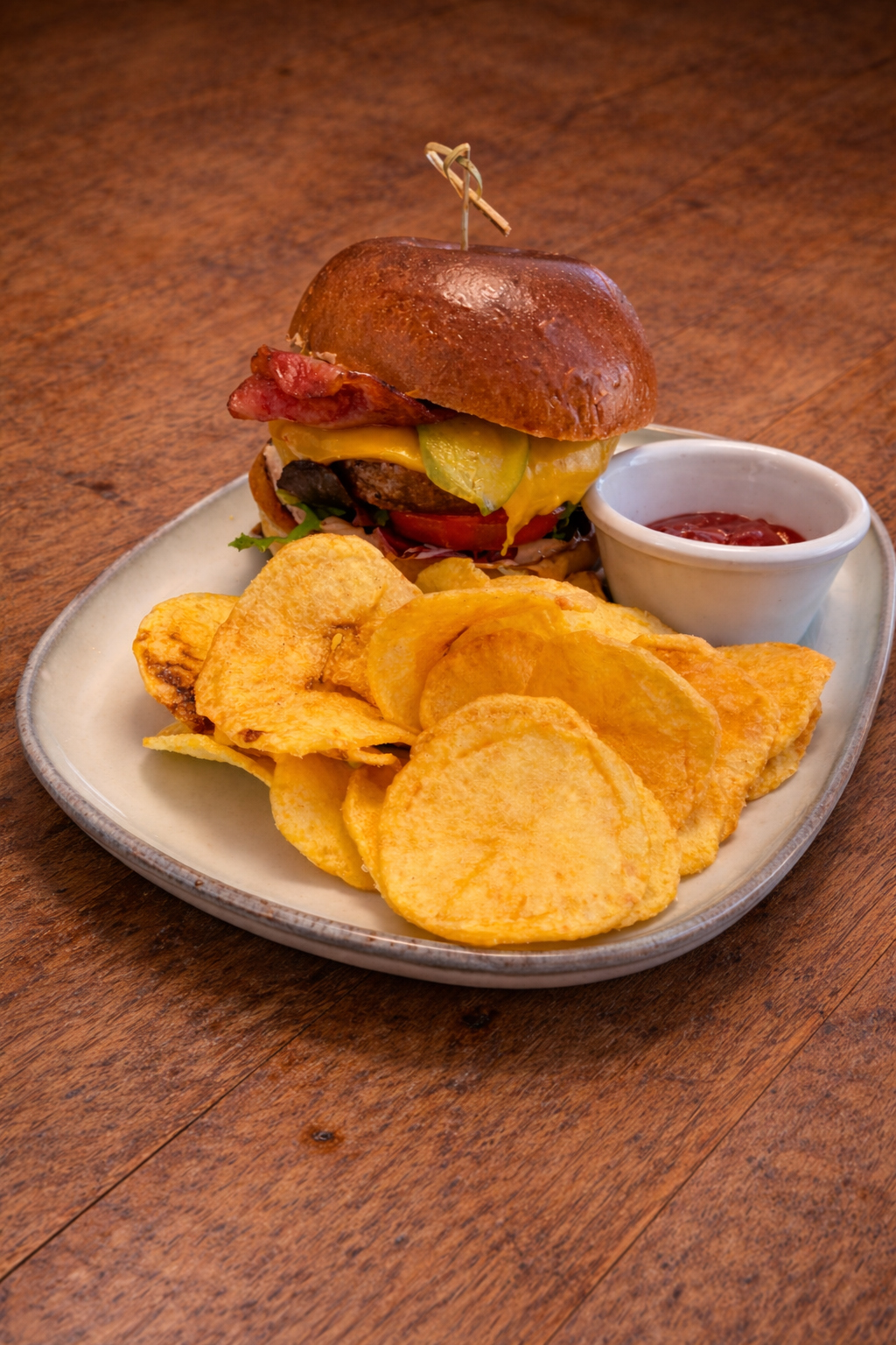 Hamburguesa 100% cebón (queso, chedar, pepinillo, bacon y mayocurry)